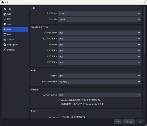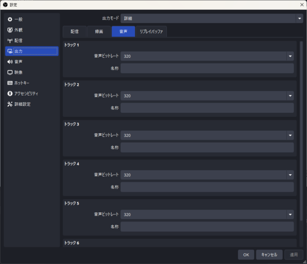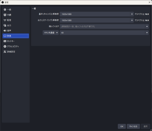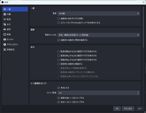 よく使うのは「配信」「出力」「音声」「映像」の4項目ですね~
