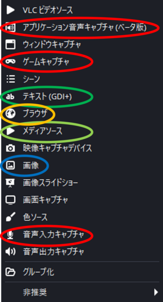 ソースは、何を映像として映して、何の音を乗せるか決めるところで、ゲーム画面やテロップなどはここに入れます~