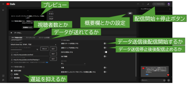 YouTube Studioの配信管理画面の見方は、下の画像にまとめてるので、見て頂ければと思います~