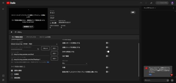 YouTube StudioもしくはOBS上から配信枠立てて...